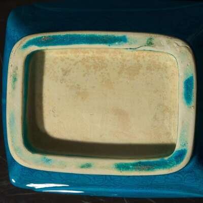 Of lobed baluster form, the sides molded with "peach" silhouettes incised with peony, all against a dense floral scroll ground; the turquoise of a rich tone, pooling to deeper blue