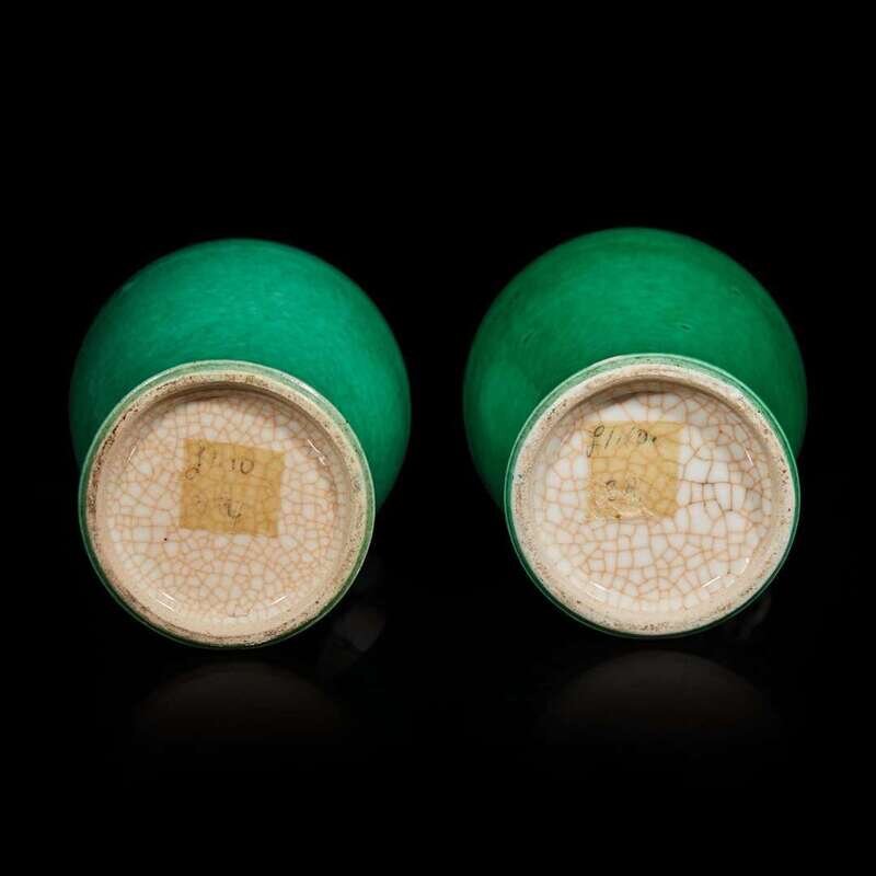 Each with baluster-shaped body, slightly everted lip, the exterior with an apple-green glaze with subtle craquelure throughout, the white-glazed interior and underside with fine russet craquelure.