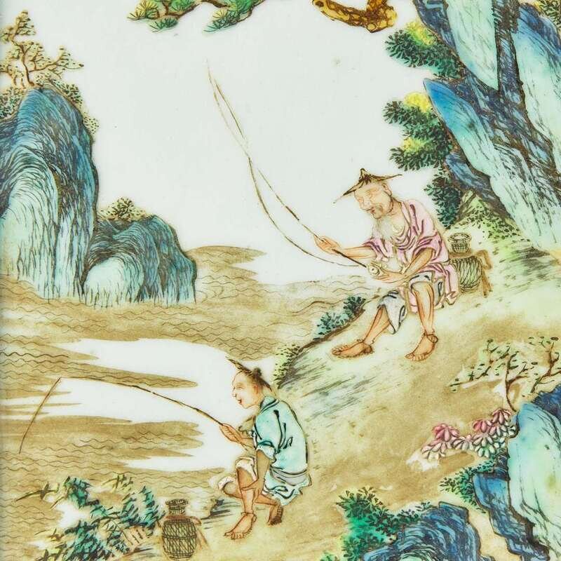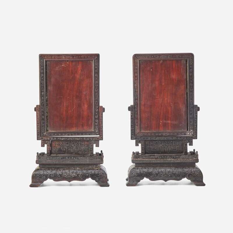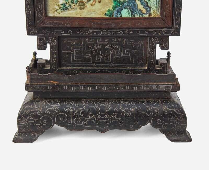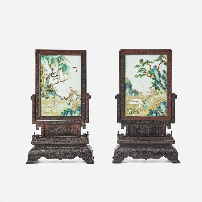 A pair of Chinese porcelain plaques with silver wire-inlaid wood stands 粉彩瓷板插屏一對 Late Qing to Republic period ?????