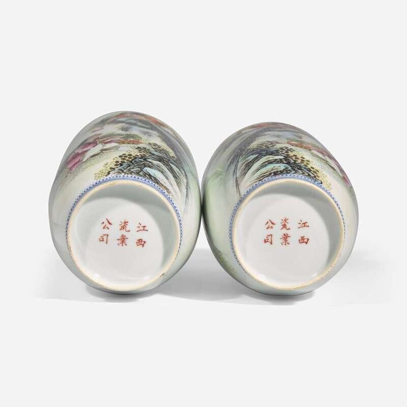Both decorated with the Hehe Erxian in rich palette, graceful blue-enameled borders to both rim and foot ring, inscription with mark and dated to the cyclical year "yiyou", equivalent to 1945, "Jiangxi ciye gongsi" (Jiangxi Porcelain Co) mark to the underside.
