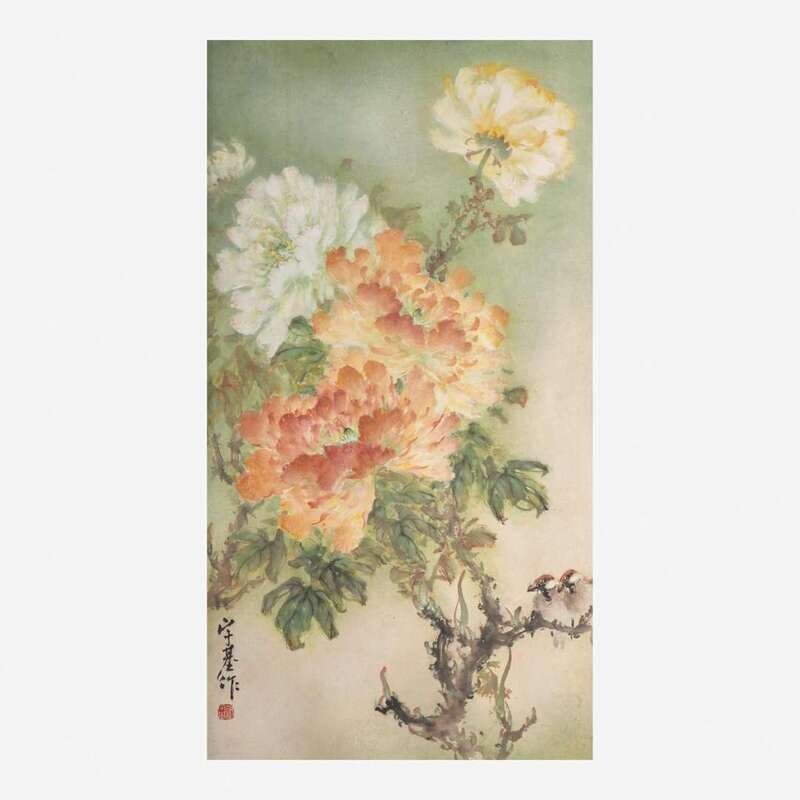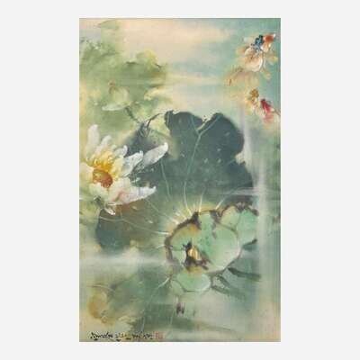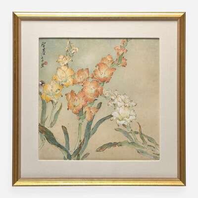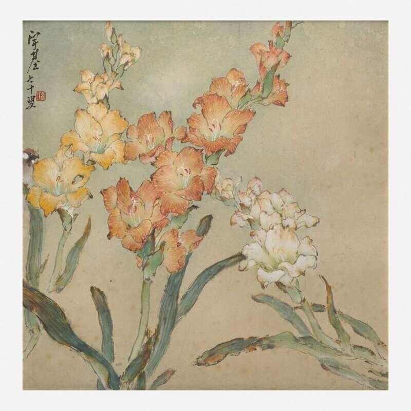 Three works, ink and color on paper: SPARROWS ON A FLOWERING TREE PEONY, signed and with one seal lower left; "LOTUS AND GOLDFISH II", signed and inscribed and with one seal upper left; "RED GLADIOLAS", signed and inscribed "seventy years old", one seal; all framed and matted.