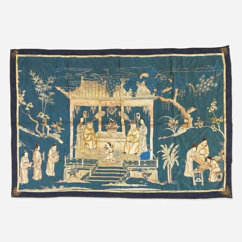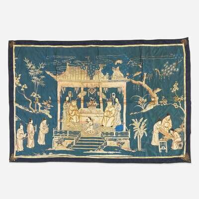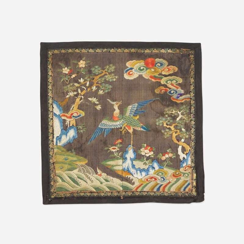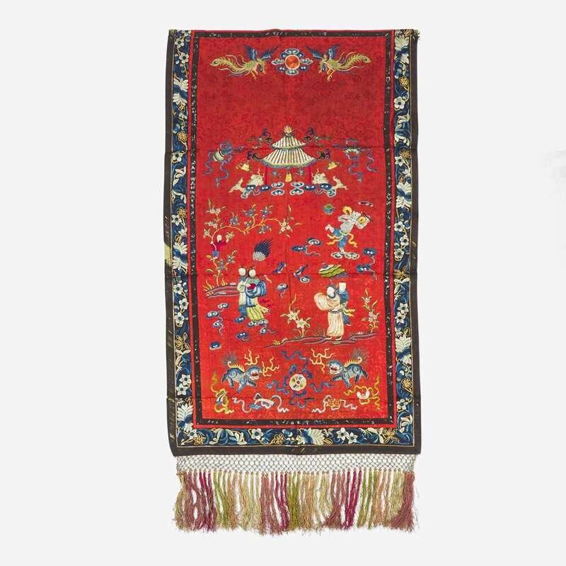 Comprising a textile panel depicted "Fenyang palace" with various figures; a vertical red panel embroidered with Buddhist treasures and scholarly figures, deep knotted fringe along the bottom; a civil rank badge.