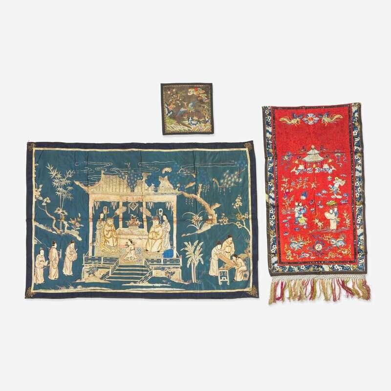 A group of three Chinese embroidered silk textiles 刺繡一組三件 Qing dynasty ?
