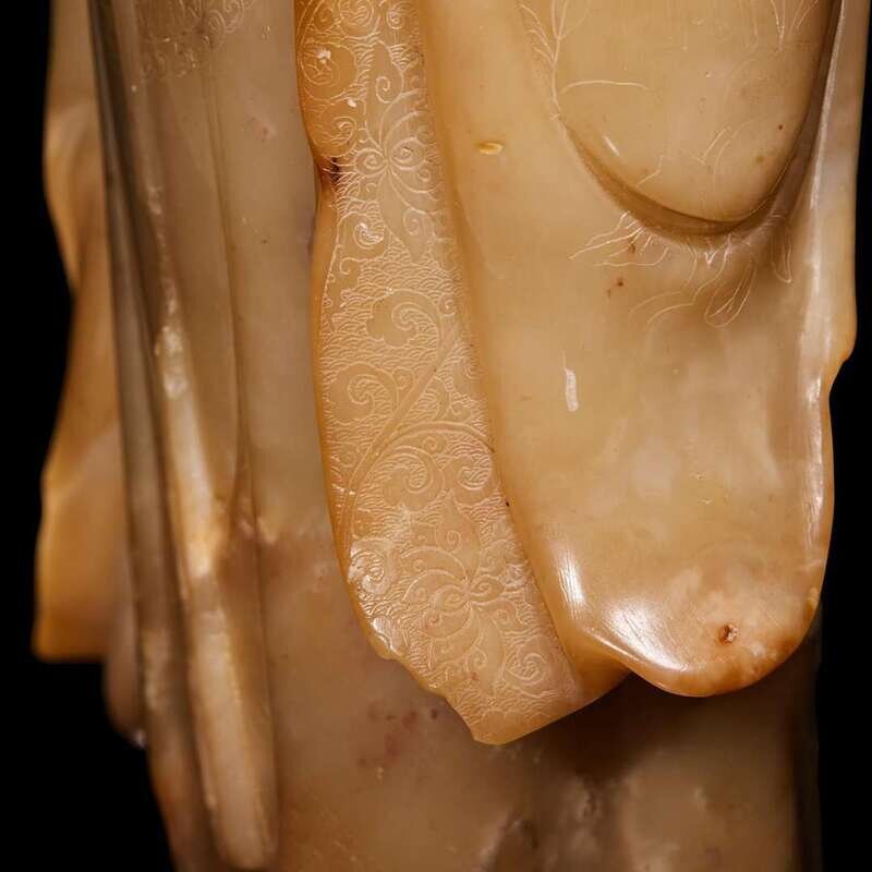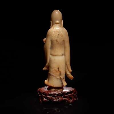 The standing figure with ruyi scepter in one hand, his robes finely incised with various motifs, separate reddish-brown soapstone "rockwork" stand