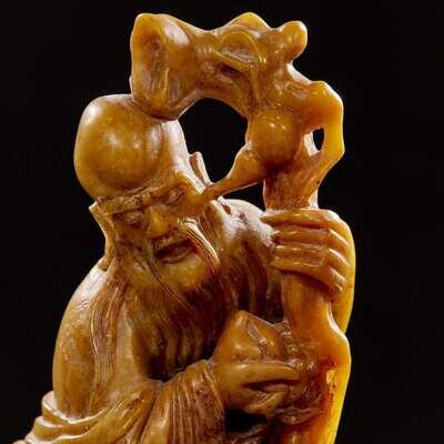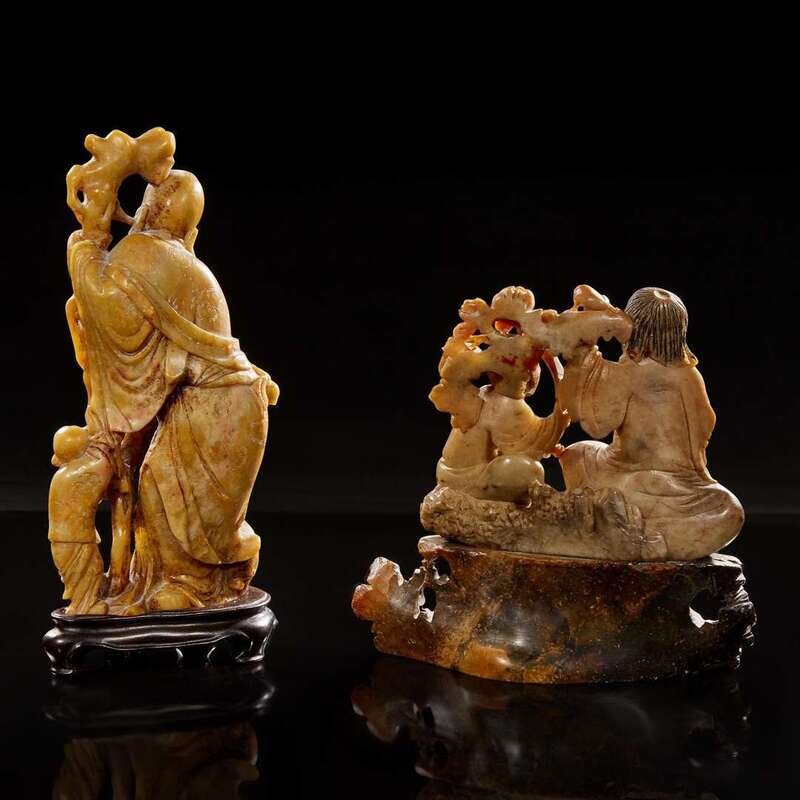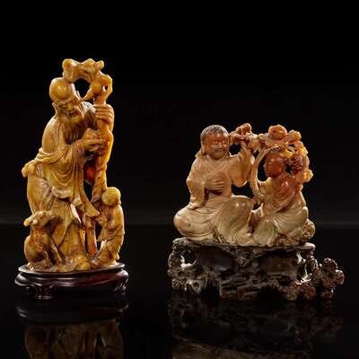 Two carved Chinese soapstone figures: Shoulao and attendant, and Liuhai and attendant 壽山石雕劉海壽老兩件 Late Qing to Republic period ?????