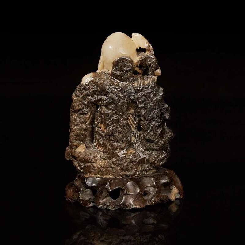 Depicted seated on rockwork base, with peach in one hand, a spray of lingzhi in other, cleverly carved to incorporate the colors of the stone