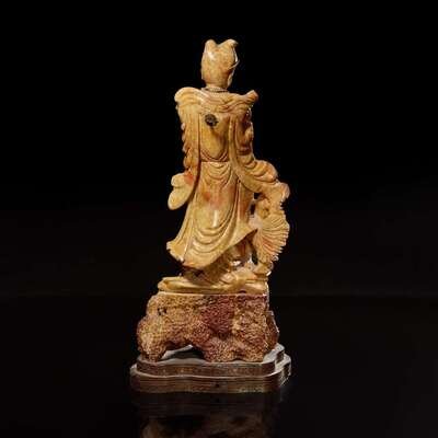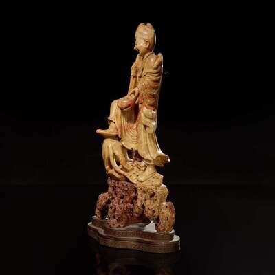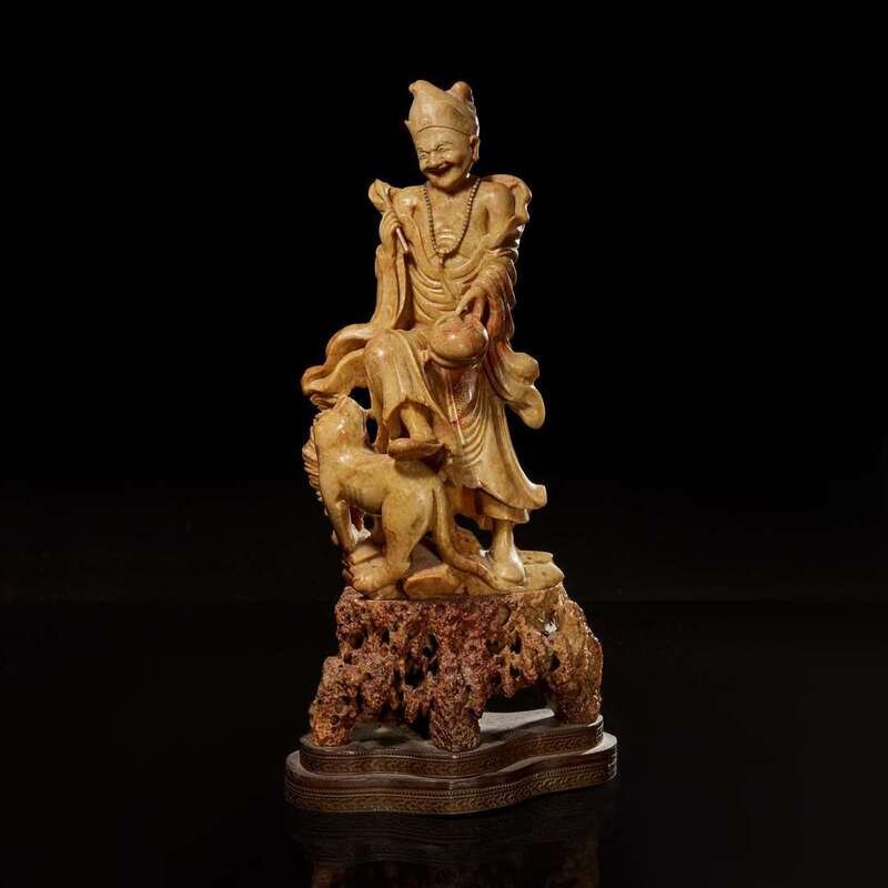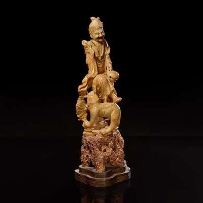 A Chinese carved beige soapstone figure of an immortal or monk with tiger 壽山石雕伏虎羅漢 Republic period or earlier ?????