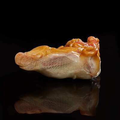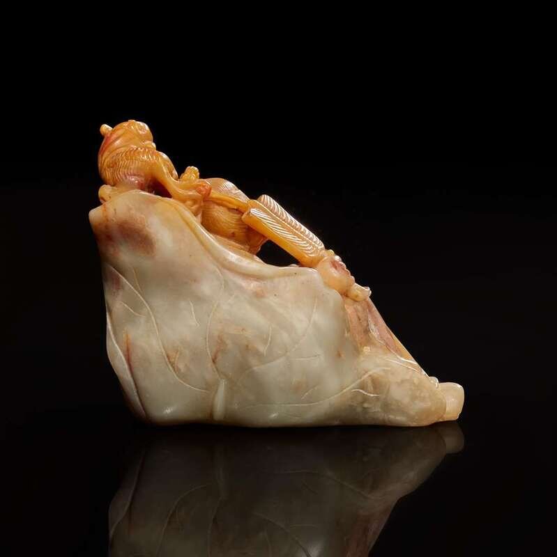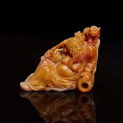 A Chinese carved amber and grey soapstone figure of Li Bai and Lion 壽山石雕李白與小獅