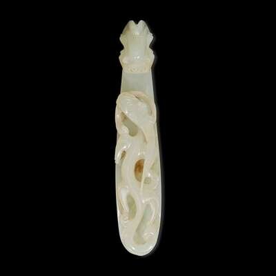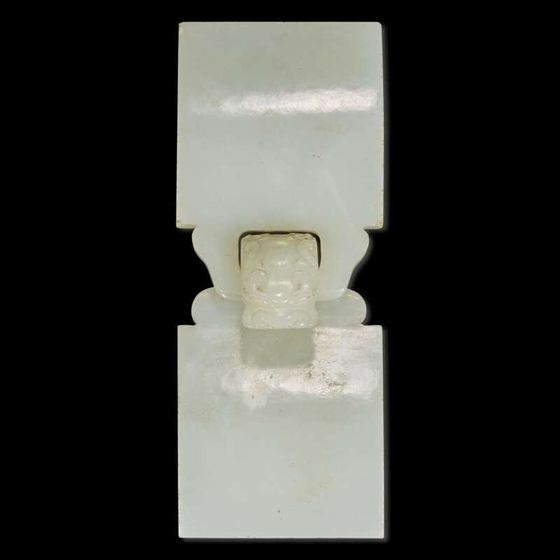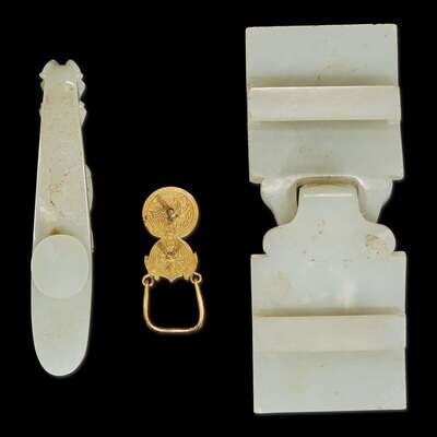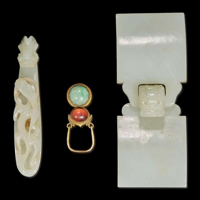 Both of even pale white jade, one carved with a dragon head and a sinuous qilong, the other of square form with beast-head hook; the third a hardstone-mounted gilt bronze buckle segment.