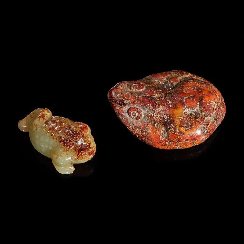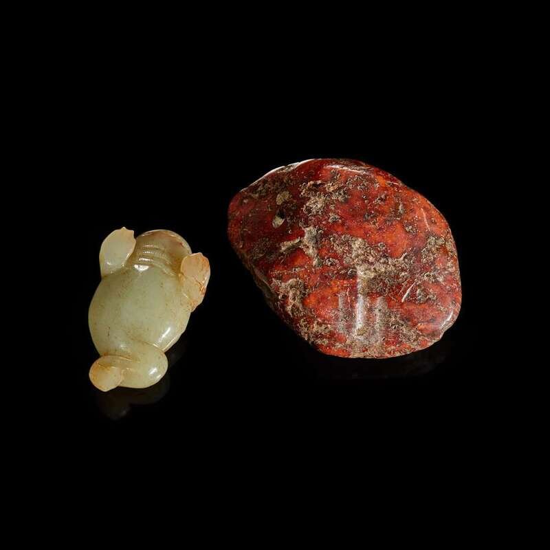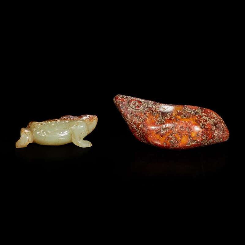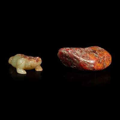 One of a mottled russet pebble form, underside pierced twice for suspension; the other a three-legged toad of celadon jade with russet, highly polished.