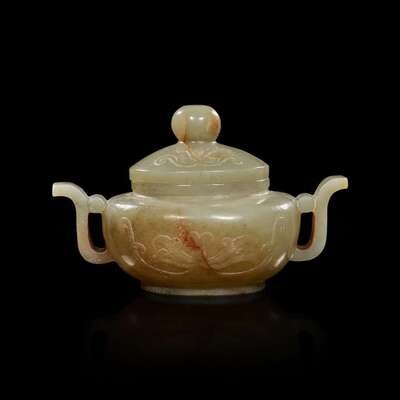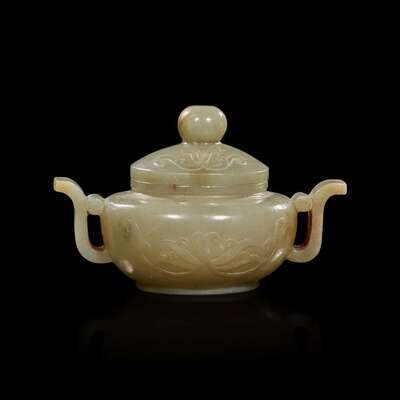 Decorated with stylized lotus to body and cover, a pair of handle to each side, raised footring to the underside.