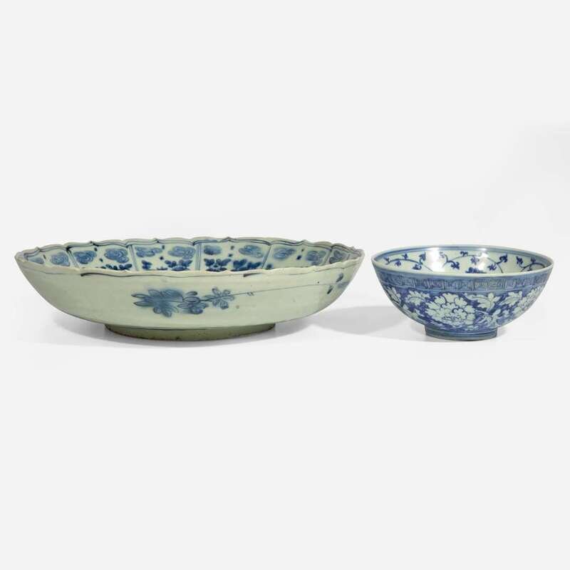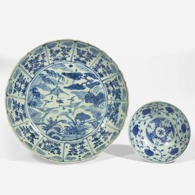 The bowl decorated with lotus scrolls on both interior and exterior, interior centered by stylized blossoms, exterior rim with continuous fret pattern; the interior of the dish centered by egrets, pine trees and rocks, surrounded by lotus petal-shaped panels of flowers and clouds, exterior rim decorated with simple floral design.