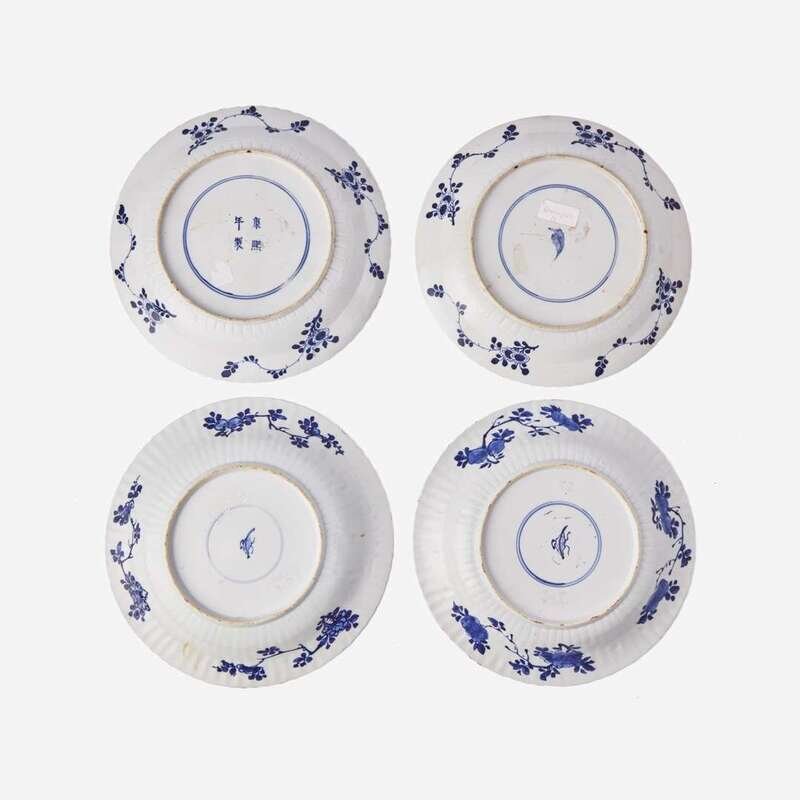 Comprising two similar molded dishes, Kangxi period, with scalloped rims, decorated with birds, flowers and rockwork, undersides with stylized artemesia leaf; and an associated pair, one bearing four-character Kangxi marks, the other a stylized Artemesia leaf, but likely later, finely decorated with elaborate floral composition, floret and trellis border.