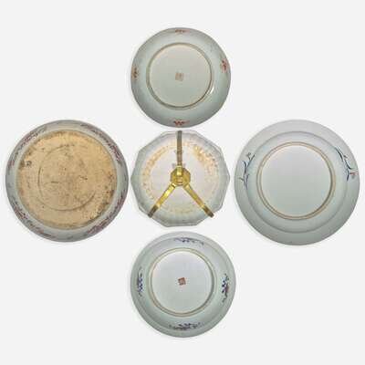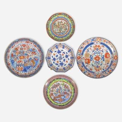 Five Imari pattern and clobbered Chinese export porcelain dishes 外銷瓷及日本風格瓷器一組五件 18th to early 19th century ????????