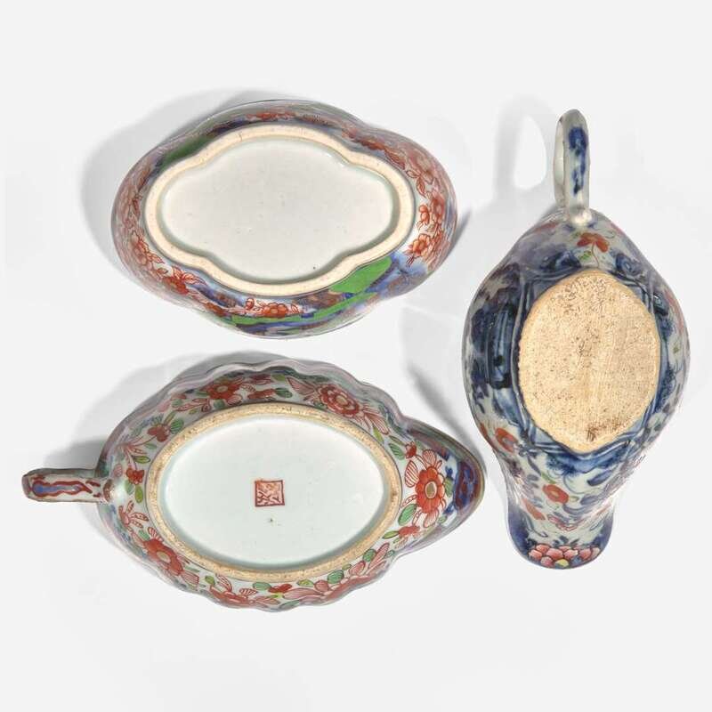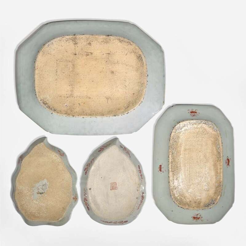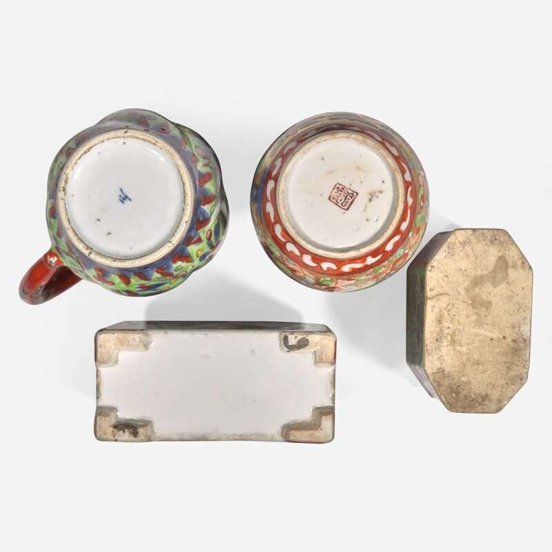 Of various patterns and decoration, comprising two octagonal trays; two leaf-shaped dishes; a small molded jug, underside with "yu" ("jade") mark in underglaze blue; two rectangular tea caddies (one with silver cover); a small bottle vase; two sauce boats; and a small shaped covered dish. Three pieces with pseudo seal marks