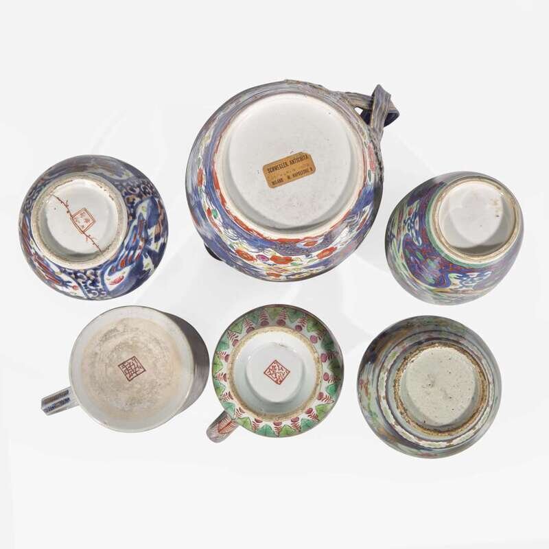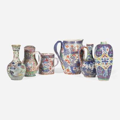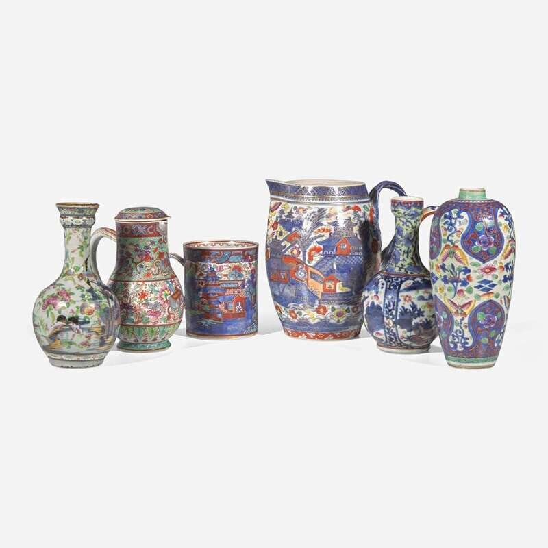 Comprising: a Japanese ewer (underside with pseudo seal mark), a Chinese ovoid vase, a Chinese jug and cover (underside with pseudo seal mark); a large Chinese cann (underside with pseudo seal mark); a Chinese cider jug, and a Chinese guglet vase.
