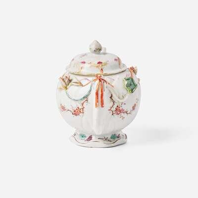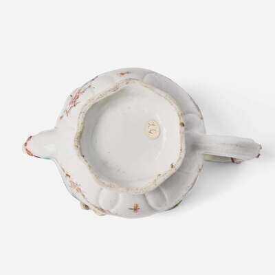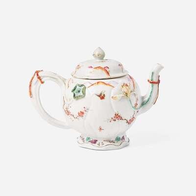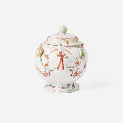 The teapot with shaped foot and ribbon-tied handle and spout, decorated with floral sprays, butterflies and insects, bianco sopra bianco peonies to the cover