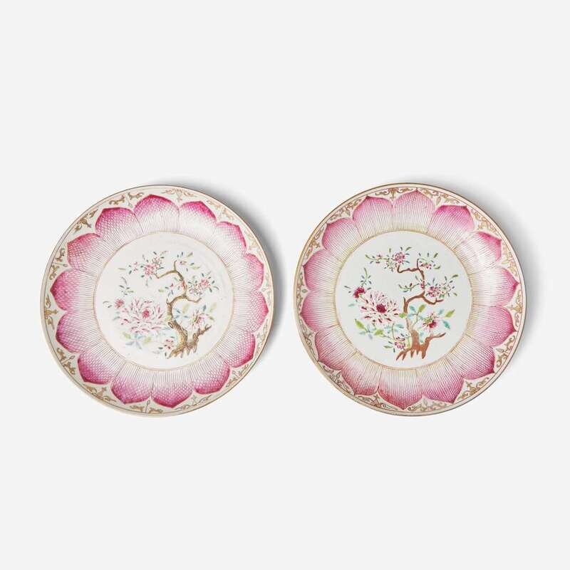 Each decorated with a central bough of peony and prunus, lotus petal border; similar border verso