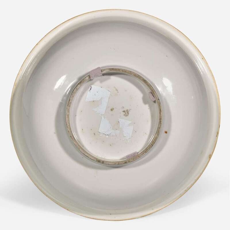 Thinly potted and with gracefully flared rim, the interior centered by a meiren and boys in a landscape, within floral scroll borders, with shaped landscape and floral reserves to cavetto, diaper border to rim.