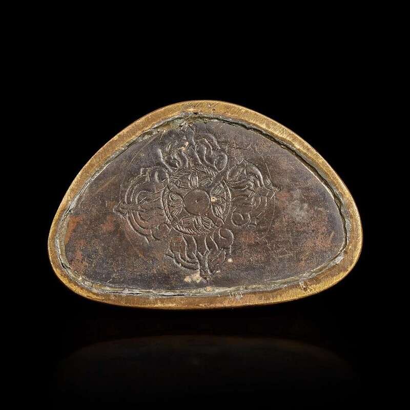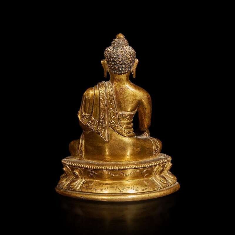 The Buddha sitting on a double lotus base in bhumisparsha mudra with elaborate robe and kasaya, incised double vajra to base plate.