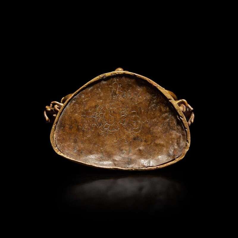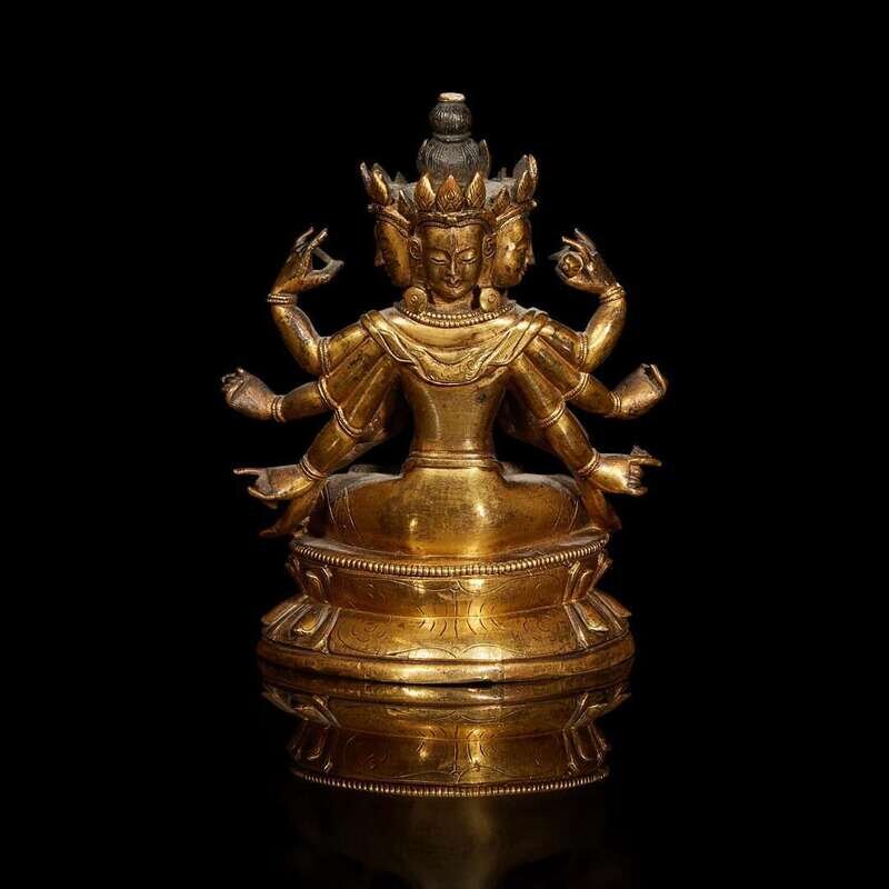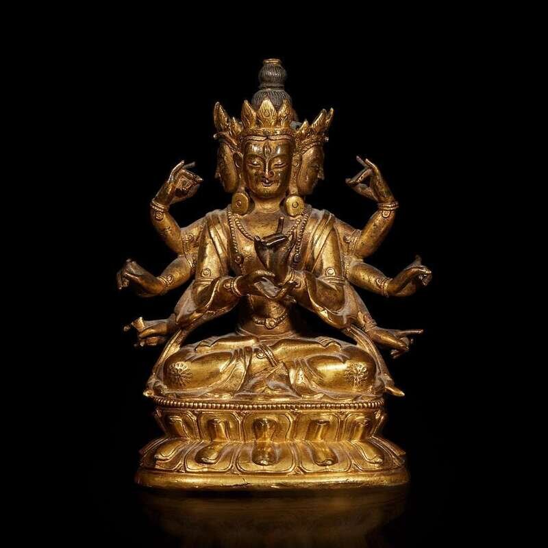 The Bodhisattva with four heads, eight arms sitting on a double lotus base, crowned; wearing long earrings, long necklaces, sumptuous garments, underside incised and sealed.