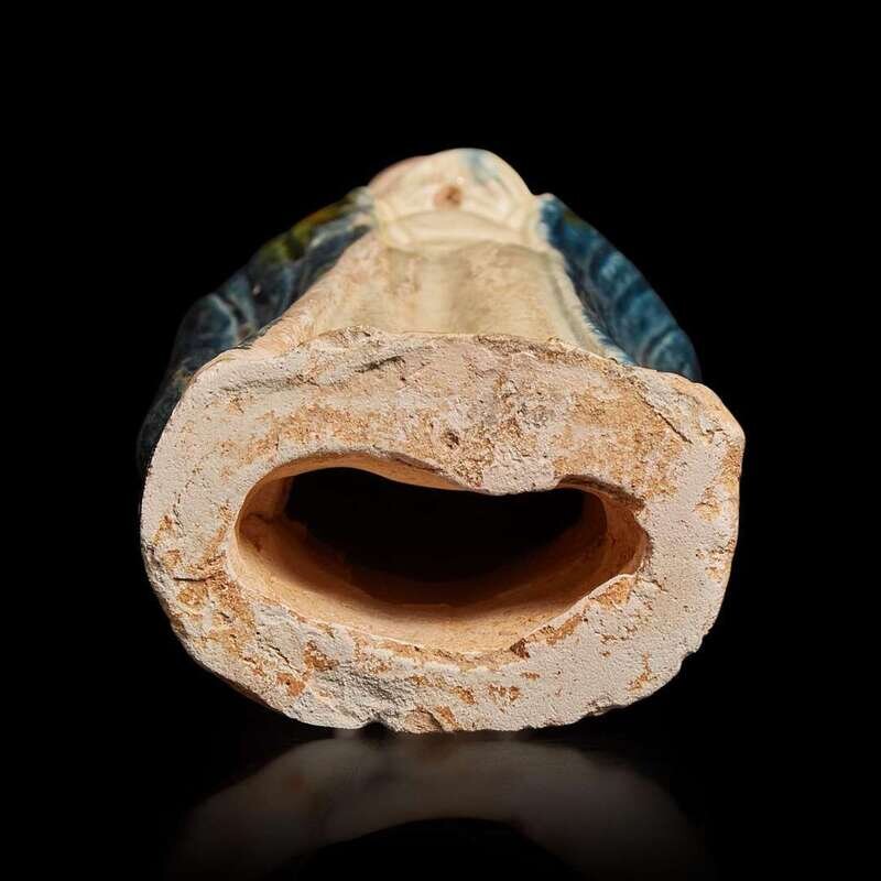 The hooded figure with unglazed head, standing with cobalt blue and chestnut-glazed long-sleeved Persian-style robe across his shoulders, his hands clasped in front of his chest