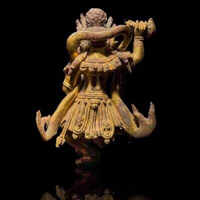 The deity cast in dancing posture, with a chopper in his right hand, and a fish in the other, wearing elaborate jewelry and accoutrements