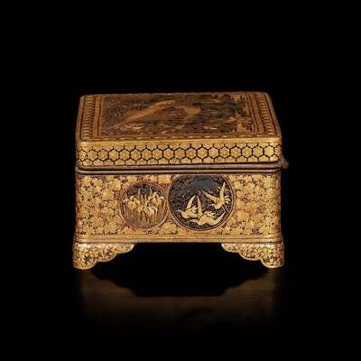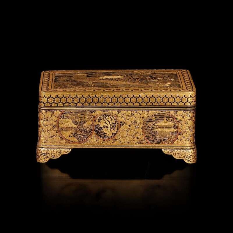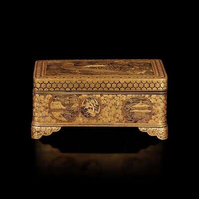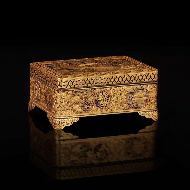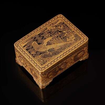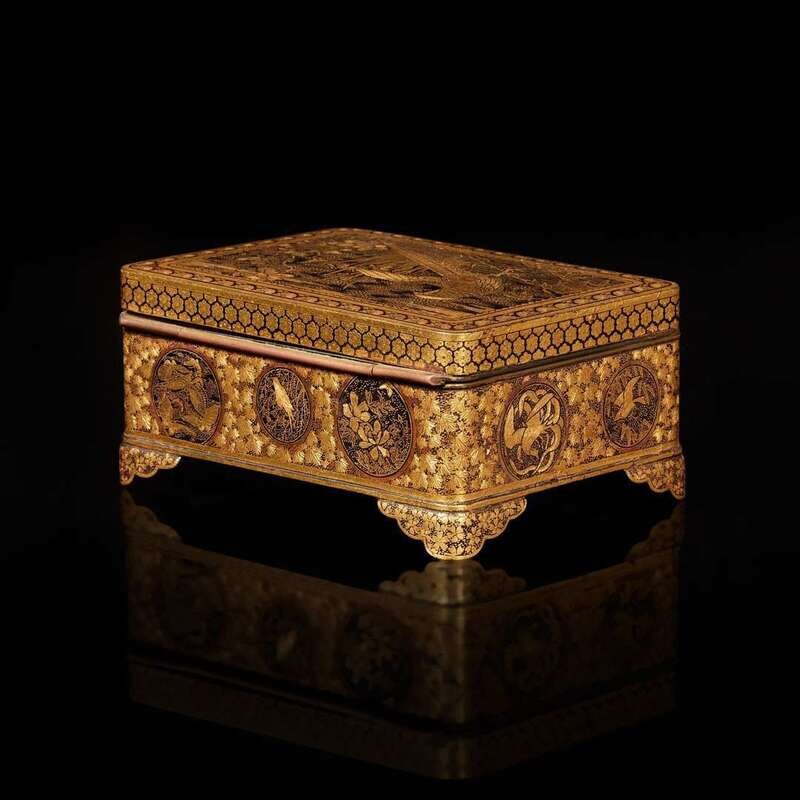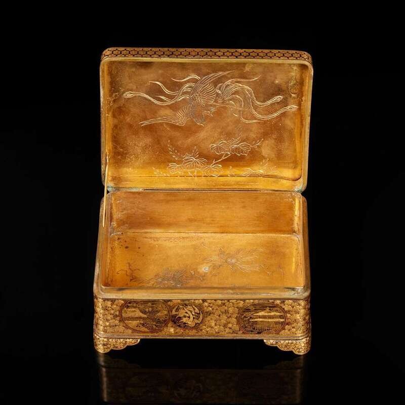 The rectangular box on four short bracket feet, the cover depicting a pheasant amidst flowers, the four sides with medallions of famous scenes, flowers, and birds, all against a leafy ground, the interior incised with phoenix and kiri, inlaid nine-character workshop signature to the underside.