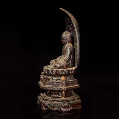 The peaceful Buddha seated in meditation on a stepped lotus throne with panels of stylized flowers, rabbit and waves; a scrolled nimbus behind; darkened gilt lacquer surface