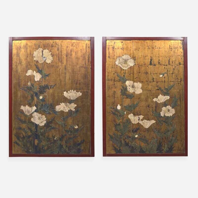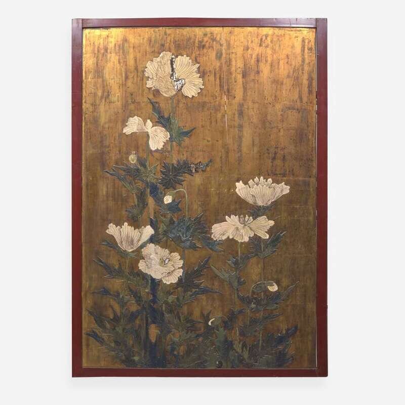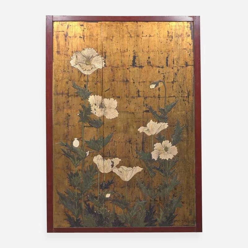 A pair of large Japanese gold-ground "Poppies" panels 日本金地罌粟花大屏風一對 Edo period ????