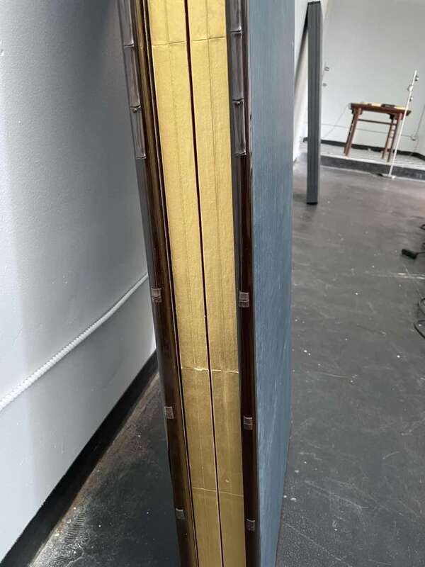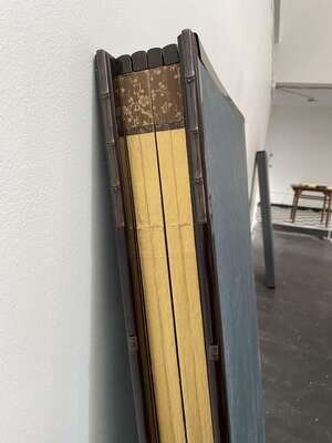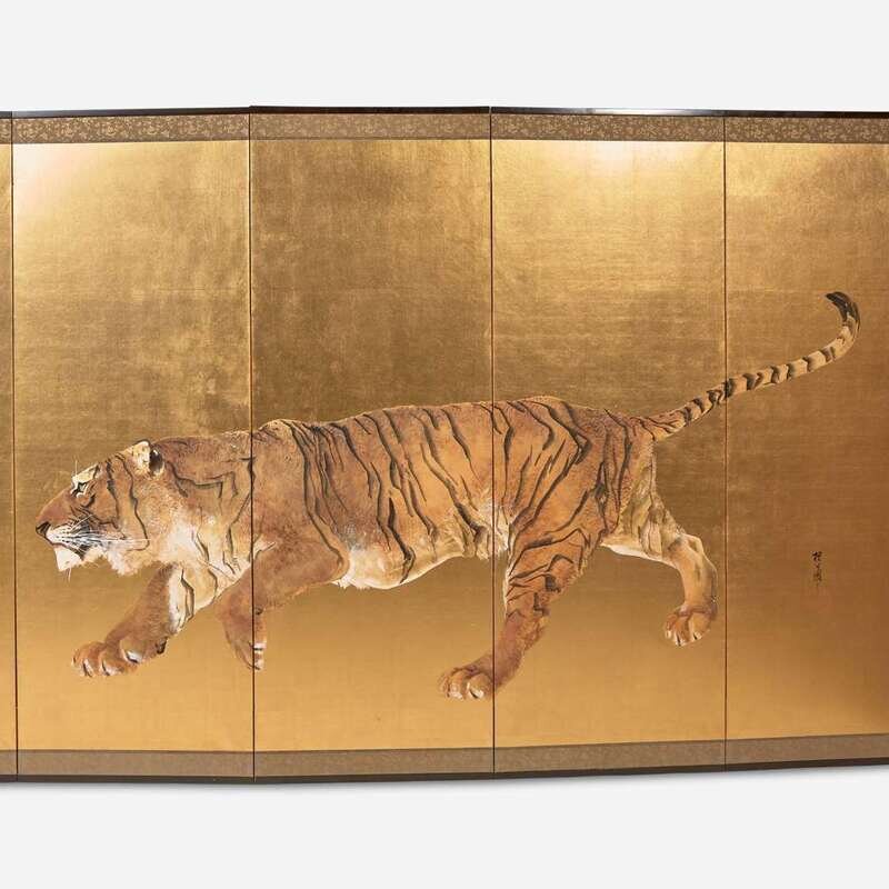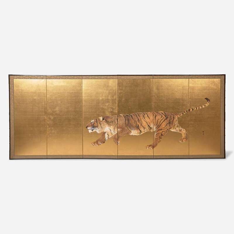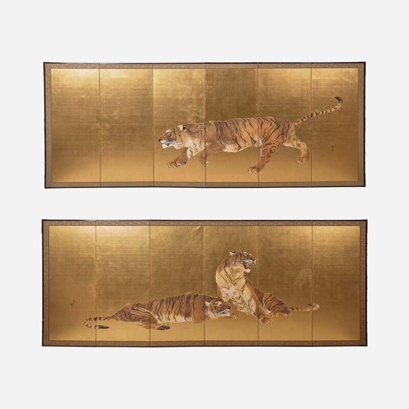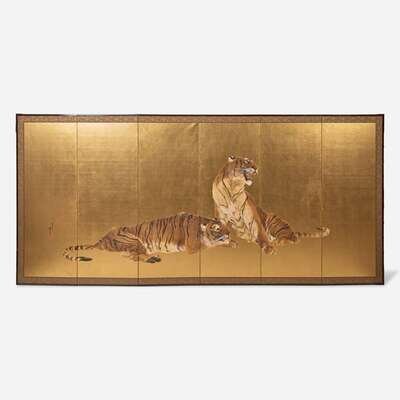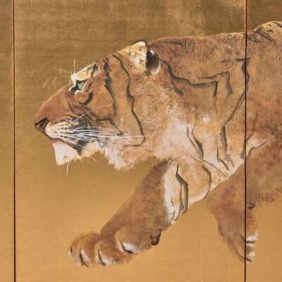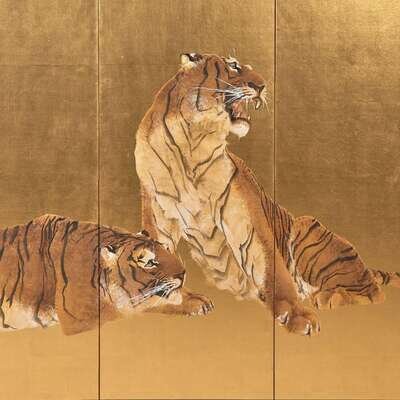 A pair of six-panel gold-ground folding floor screens; ink, color, gofun and gold leaf on paper; one painted with a running tiger, the other with a recumbent and a seated tiger, one signed: "Mizunoe-tora natsu rokugetsu Okoko sei" (year of the Tiger, Summer 2002) and the other "Okoku zushi"; both with seal mark "Okoku" to lower corner