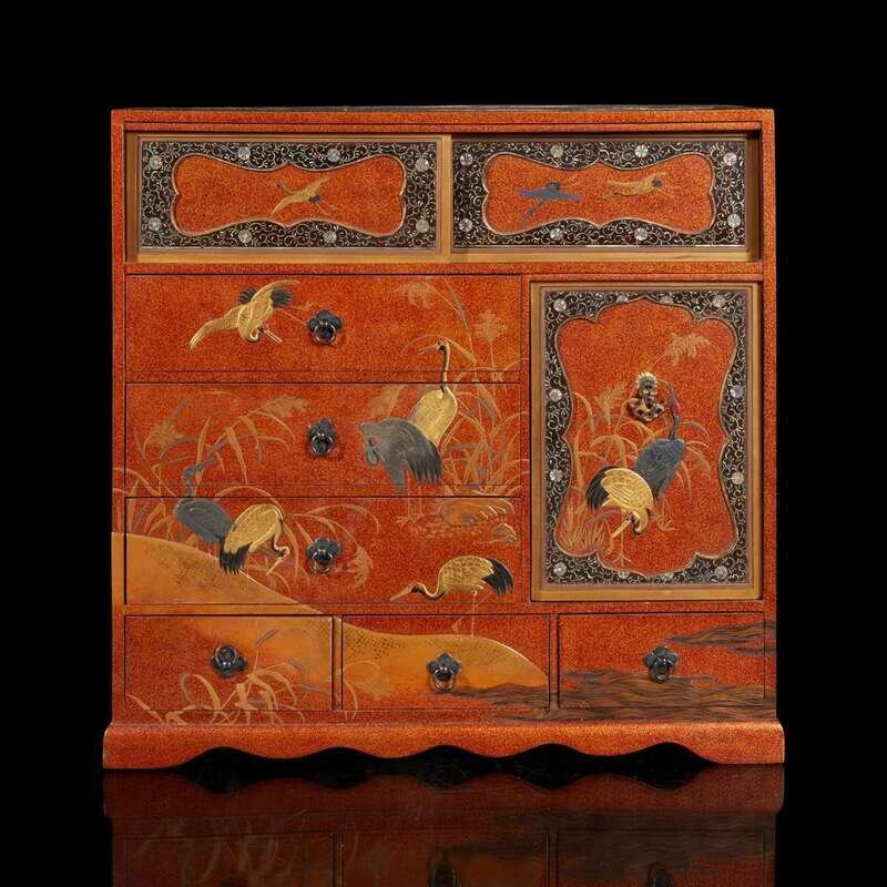 The rectangular cabinet with a pair of sliding doors over three drawers and a compartment, all over three smaller drawers; decorated with 27 cranes among river grasses and flying, nashiji ground, border of mother-of-pearl inlay to sliding doors and compartment.