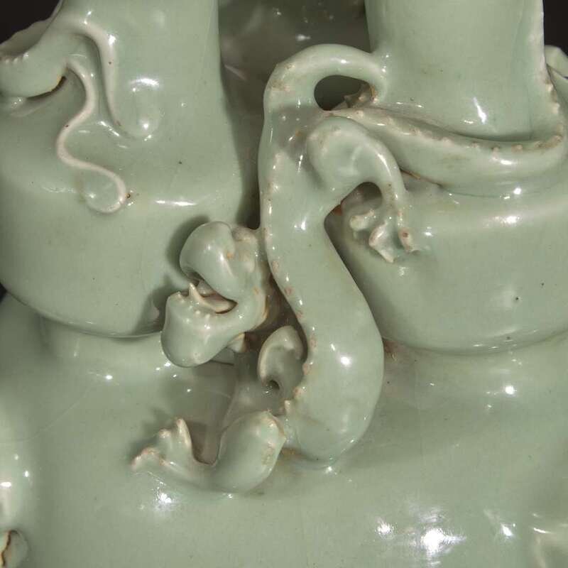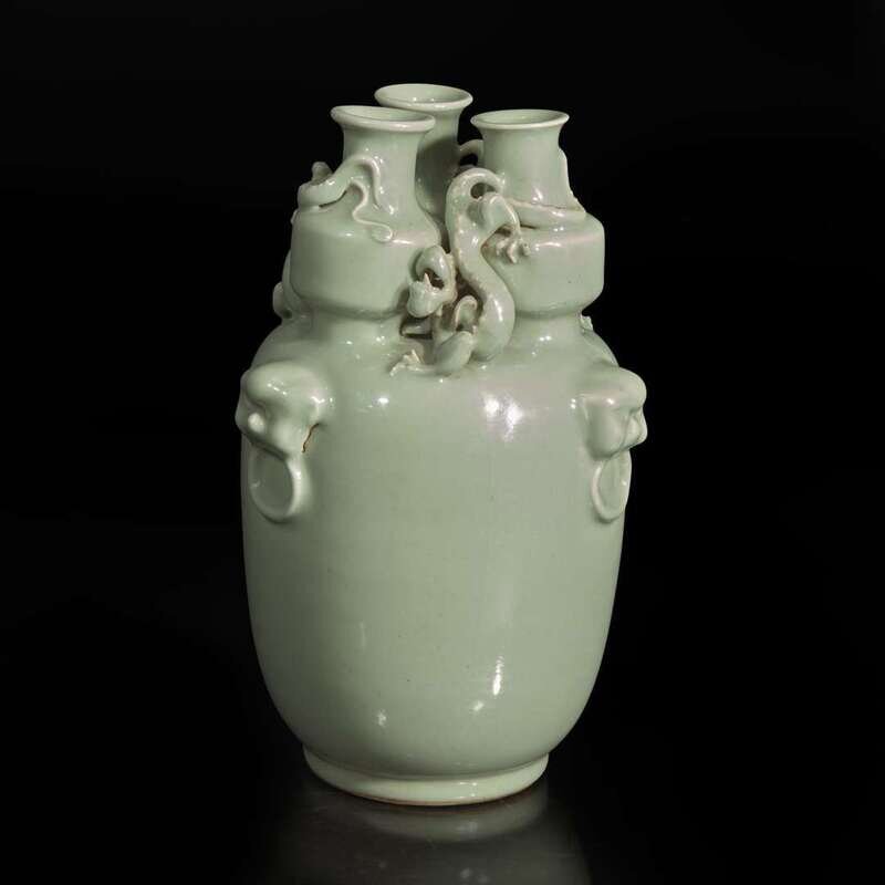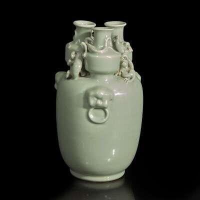 An unusual Chinese Longquan celadon-glazed triple-necked vase 龙泉青釉三口瓶 Qing dynasty ?