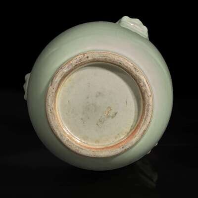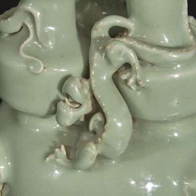 Of ovoid form on low circular foot, with three vasiform necks, entwined with three sinuous dragons, three ringed animal masks at the shoulder, thick sea-green glaze.