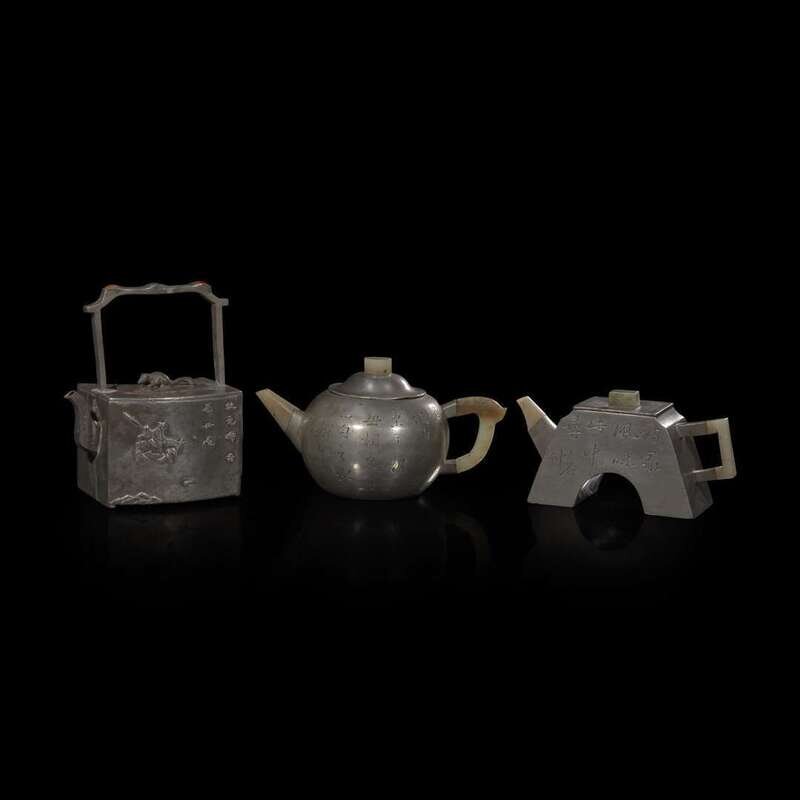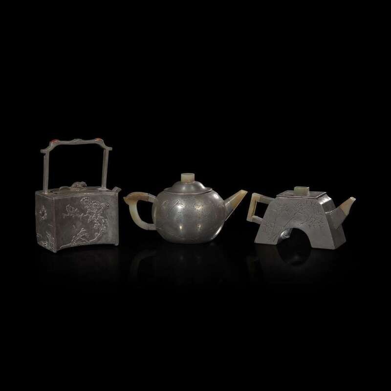 A group of three Chinese jade-mounted pewter teapots 嵌玉錫包茶壺一組三把