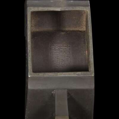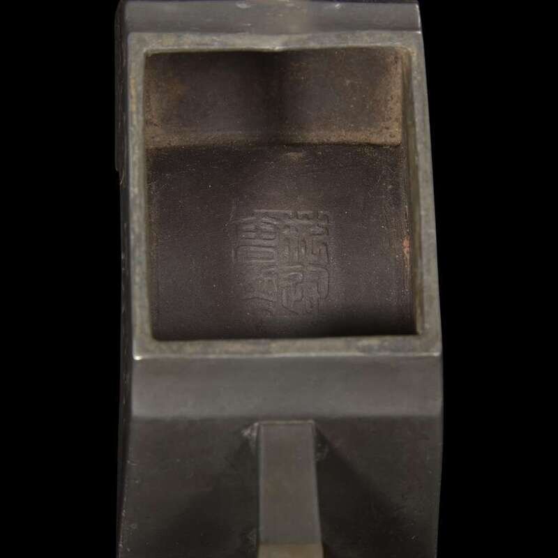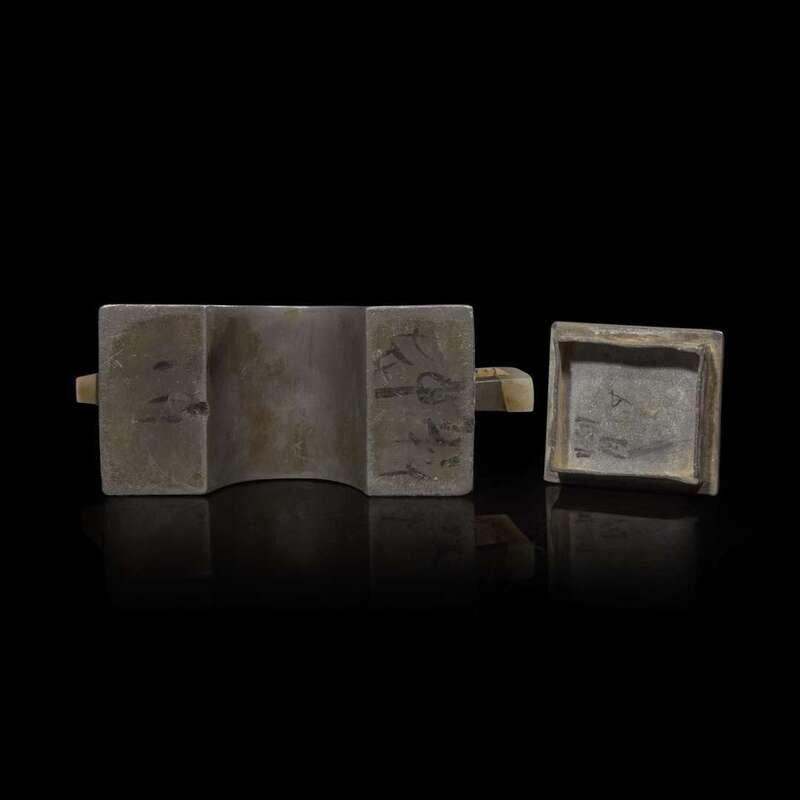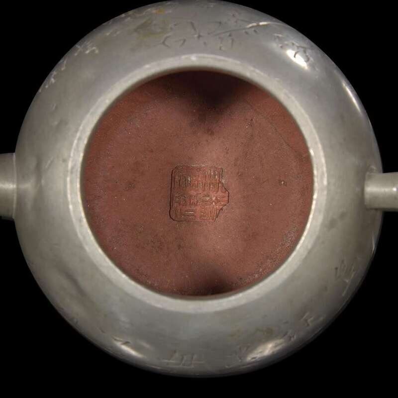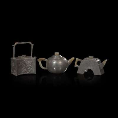 Comprising a horse hoof-shaped teapot attributed to Fan Luzeng, jade handle, finial, and spout; incised poem, signed "xiao shi", and bamboo on each side, a four-character Fan Luzeng mark to interior, ink inscription to underside and interior of cover; a globular teapot, incised with poem and prunus, jade handle, finial, and spout, "Yang Pengnian" mark to the interior; the third with hardstone-mounted vertical handle, "squirrel" knop to cover, poem and figures decorate the surface, mark to the underside.