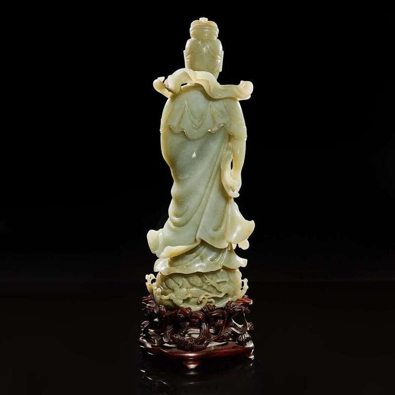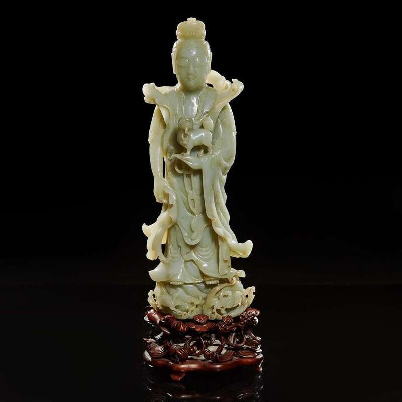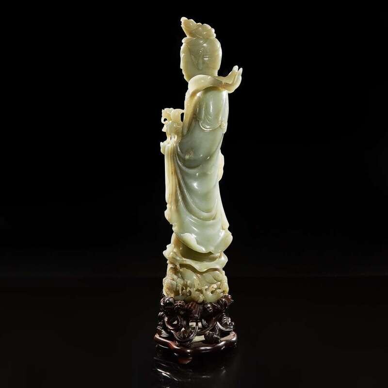 A large Chinese carved celadon jade figure of a bodhisattva 青玉雕觀音 Late Qing to Republic period ?????
