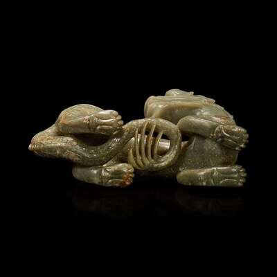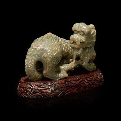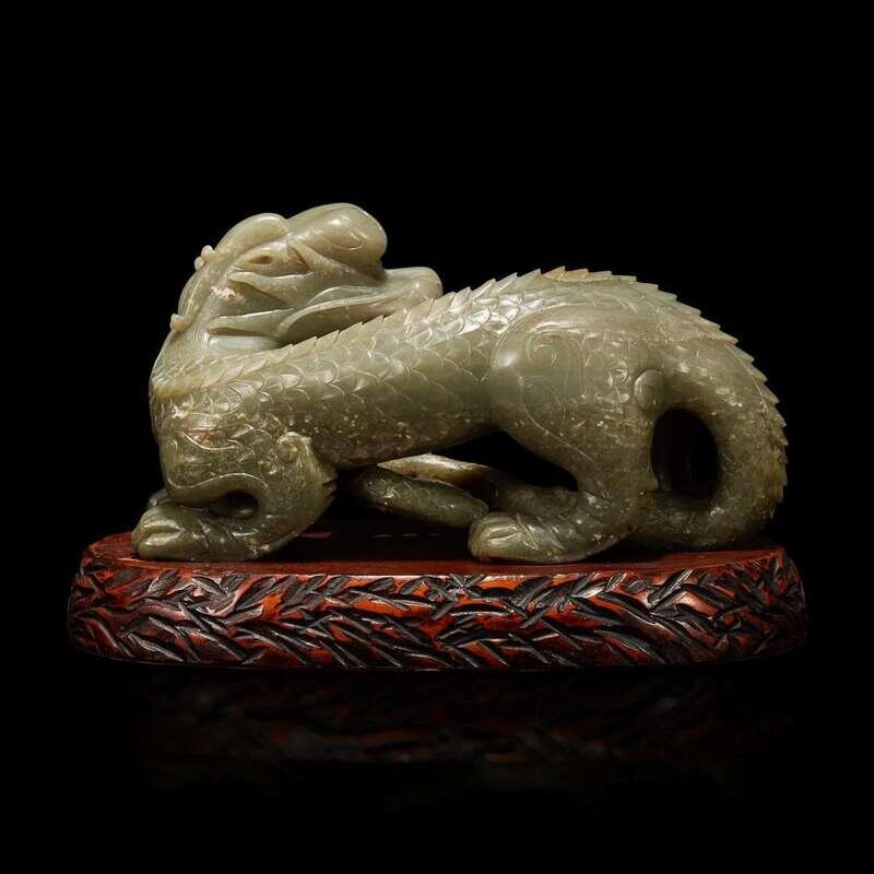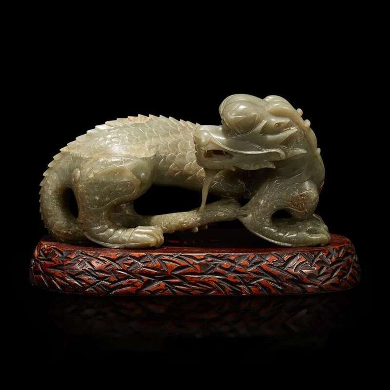 A Chinese carved celadon-grey jade dragon and wood stand 青灰玉龍及木底座