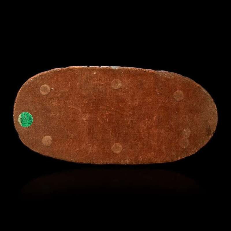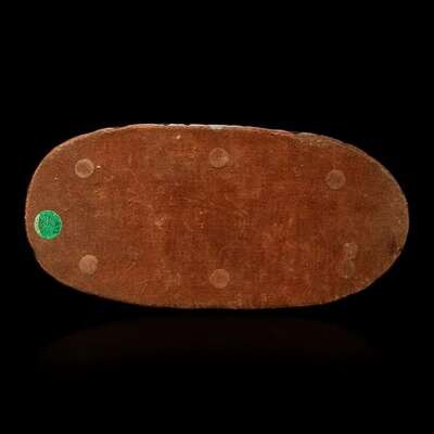 Carved as bearded dragon in mid-stride, his head turned back, with detailed features of bulging eyes, teeth, eyebrows and two horns; his body with scales, carved hair to each leg; carved wood stand