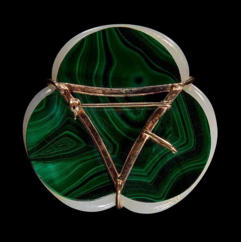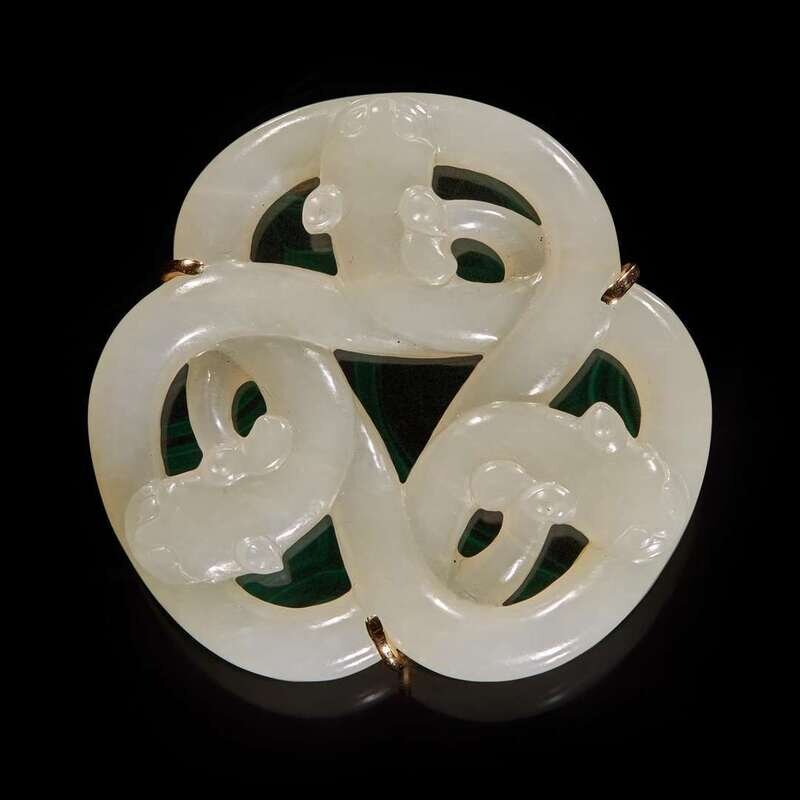 Carved with three reticulated intertwined qilong, with malachite back plate