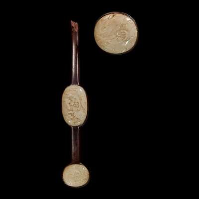 A Chinese white jade mounted hardwood ruyi scepter 嵌白玉木如意