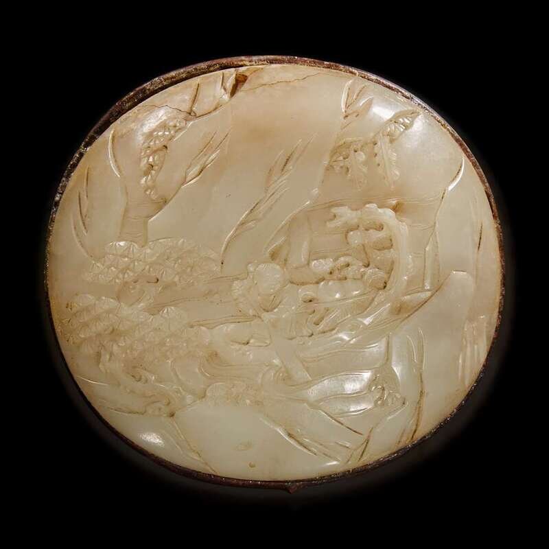 The three white jade panels carved in high relief with tongzi among landscapes.
