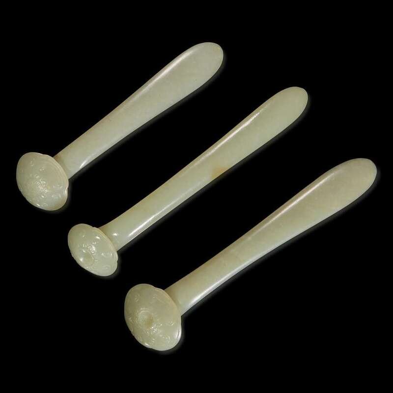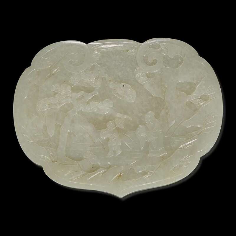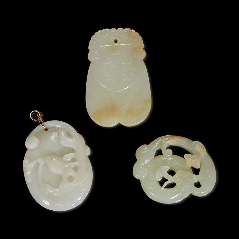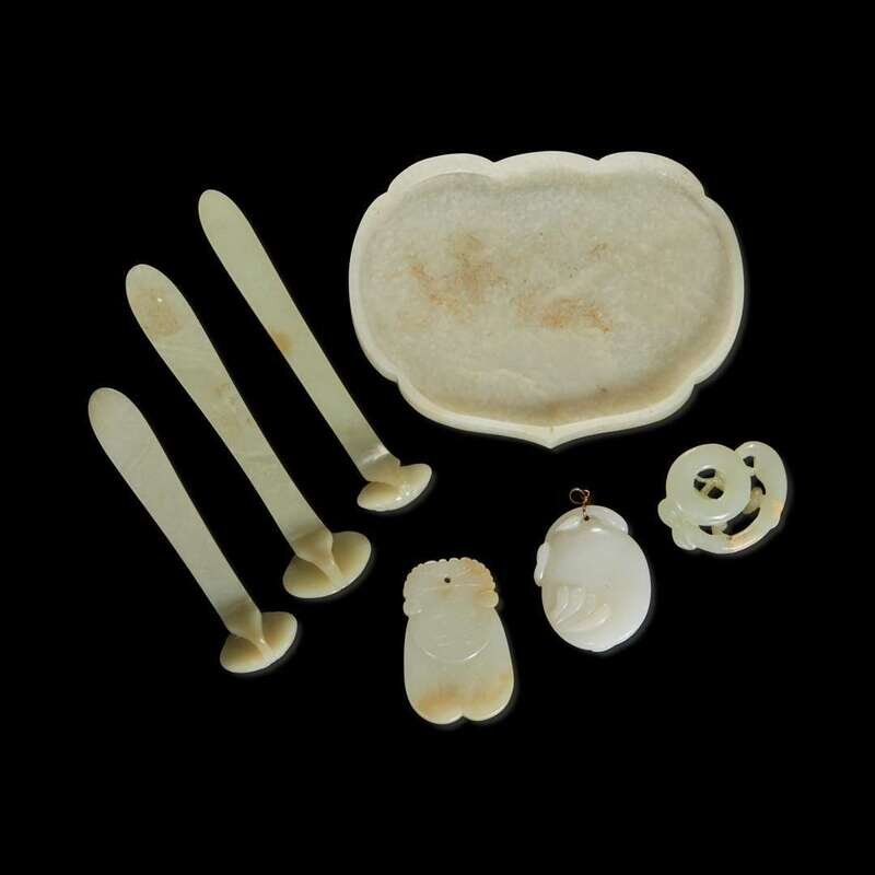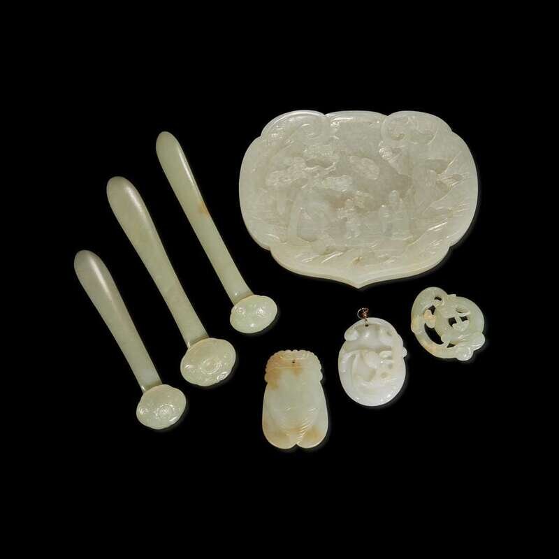 Comprising a white jade ruyi head plaque in lingzhi form, smooth surface polish, carved in low relief with Shoulao and tongzi under pine, three piercings to the edge on the underside; three hair pins; one reticulated qilong pendant, one cicada, one melon-shaped pendant