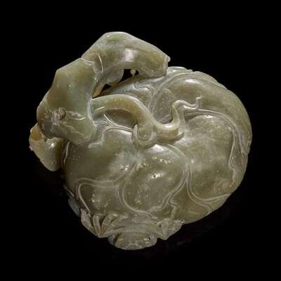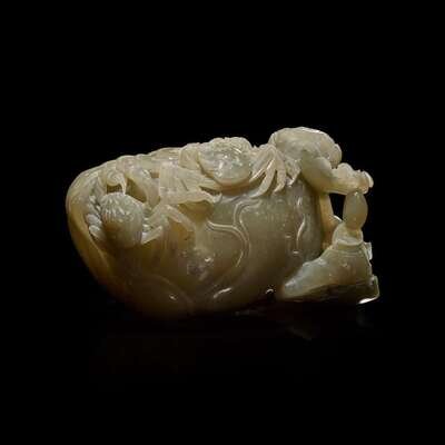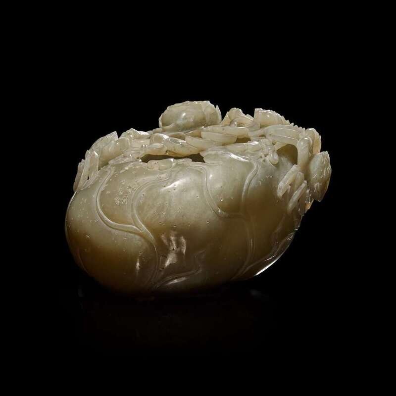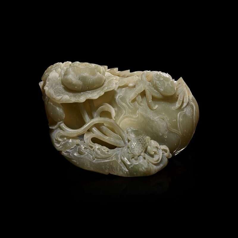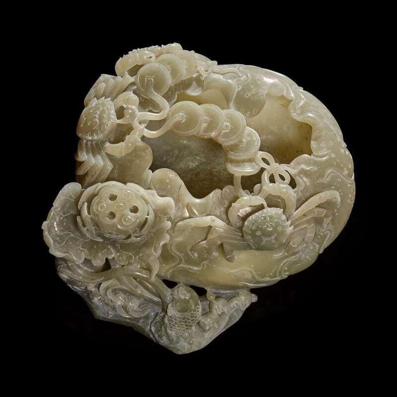 A Chinese carved greyish jade "Lotus, Crab and Fish" large brush washer 灰玉荷塘大洗子