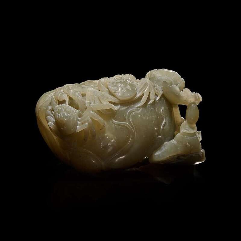 Well-hollowed, carved as a furled lotus leaf, a flower with pierced pod to the side, three crabs and a string of cash across the top, a carp and waves at the base