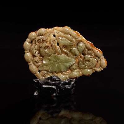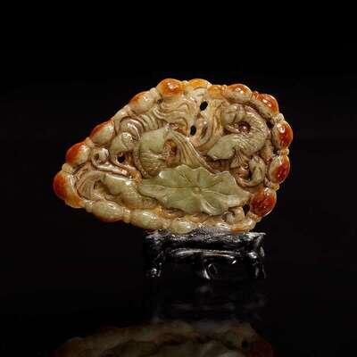 A Chinese carved celadon-grey and russet jade plaque 玉牌一件