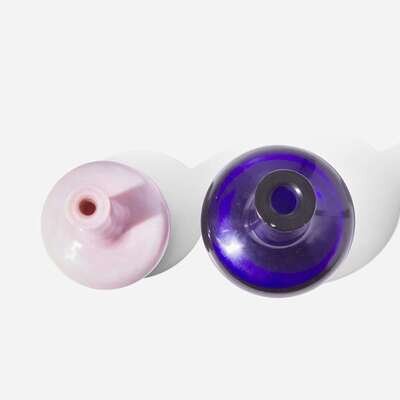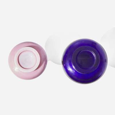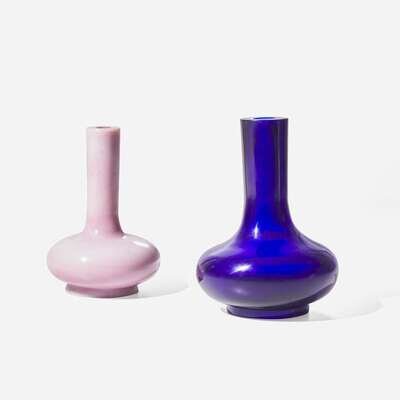 Both with elongated neck and compressed globular body, raised on low footring; the larger one of rich sapphire blue, the other a translucent pink.