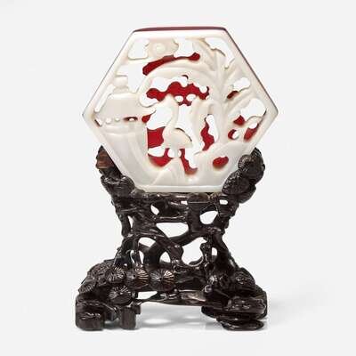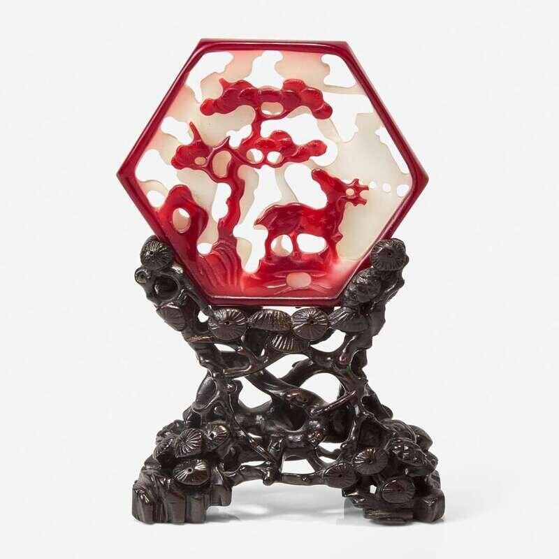 The hexagonal ruby-overlaid white glass carved and pierced with traditional Chinese subjects, the red side depicting a deer under pine tree, the white side designed as crane and pavilion; wood stand carved with pine, a white "19-1" to the underside.