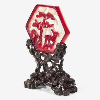 An unusual small Chinese ruby-overlay glass table screen with carved wood stand 紅白雙色琉璃硯屏及木底座 The glass Qing dynasty ?????