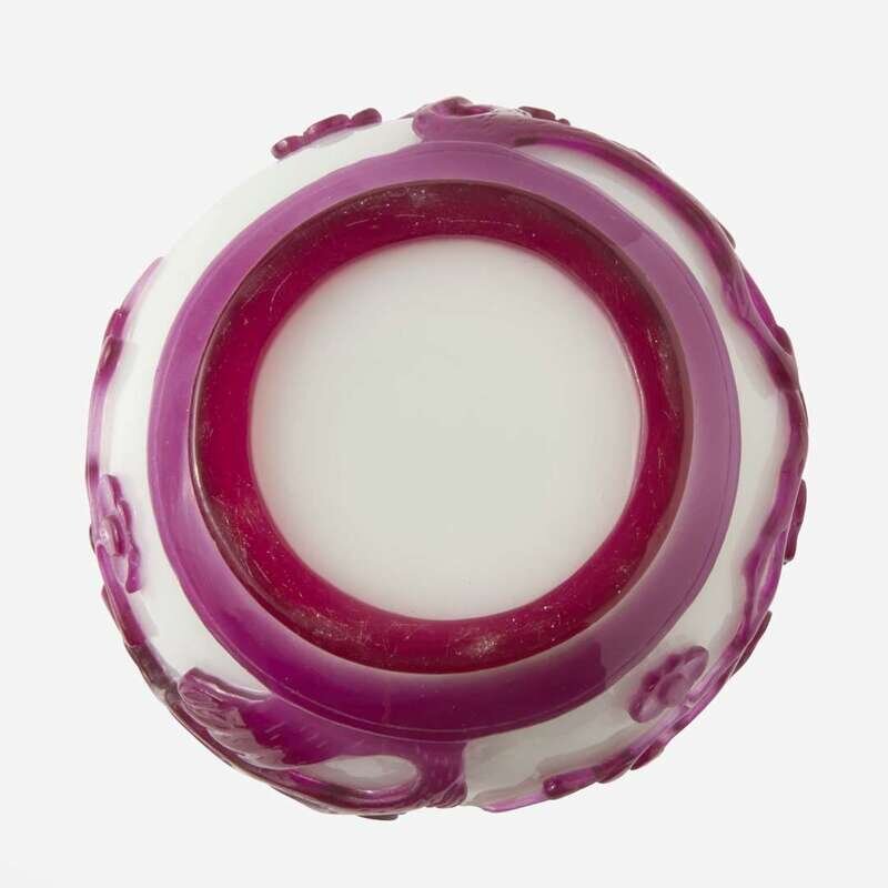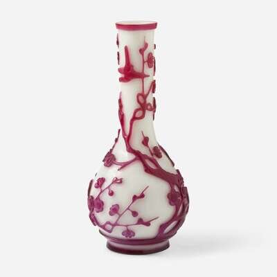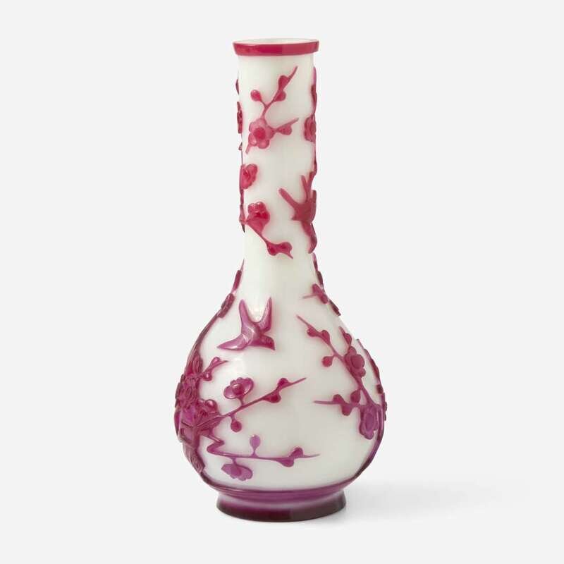 The pear-shaped bottle with elongated neck of translucent white glass with red overlay in tones of ruby and raspberry, carved with prunus and birds.